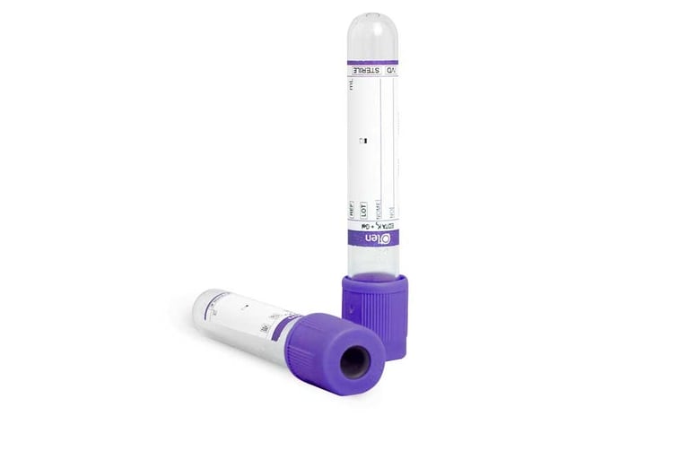 Tubos de coleta a vácuo com tampa roxa/lilás (contendo EDTA).